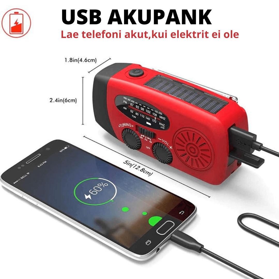Raadio laadimiseks on 3 võimalust: päikeseenergia / käsivändaga dünamo / USB toiteallikas.