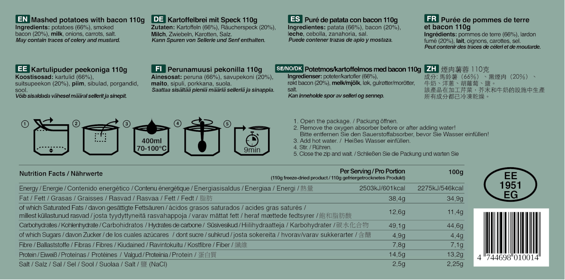 Kartulid (66%), suitsupeekon (20%), piim, sibulad, porgandid, sool. Tulenevalt tootmisliinist võib toode sisaldada vähesel määral sellerit ja sinepit.