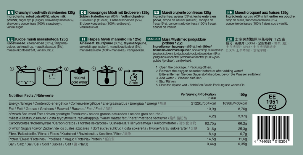 Kaerahelbed (63%), täispiima-pulber, suhkrusiirup, maasikalaastud (5%), maasikakontsentraat, vanillisuhkur.