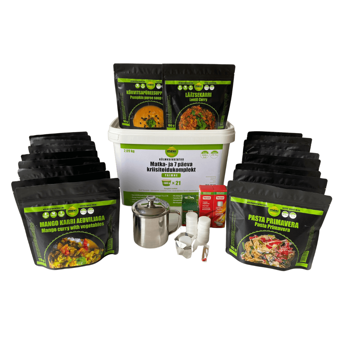 Kui suundud linnast välja matkale, kalastusreisile, jahile või hoopis blokeerib marutuulega langenud puu sõidutee ja kodust ei pääse välja mitme päeva jooksul, tuleb valmis olla. Matka- ja 7 päeva toiduvarukomplekt laseb tunda rahulolu, et toidukorrad on kaetud vähemalt terve nädala jagu. Lisaks leiad kompletist vajalikud lisad toidu valmistamiseks.