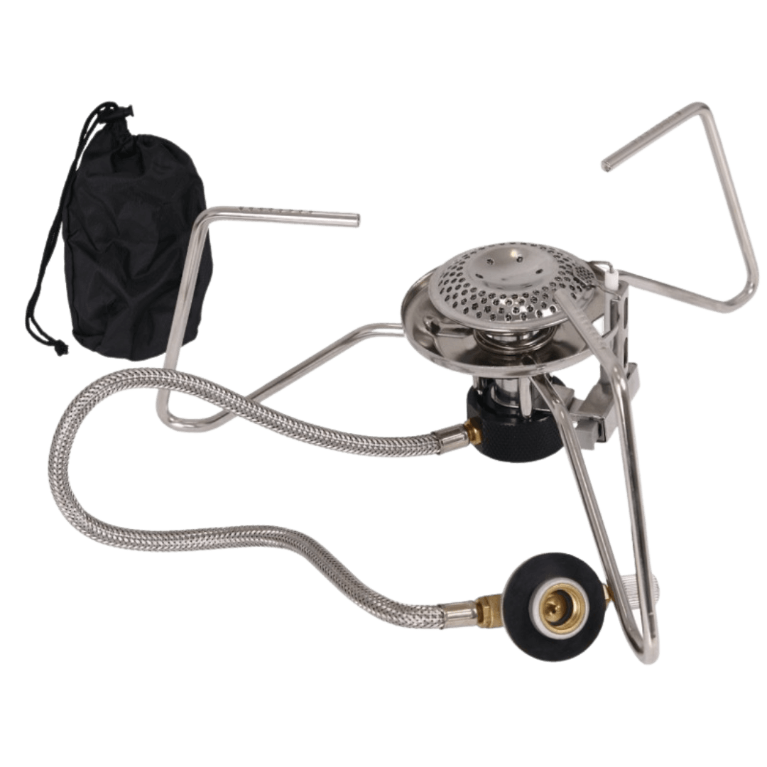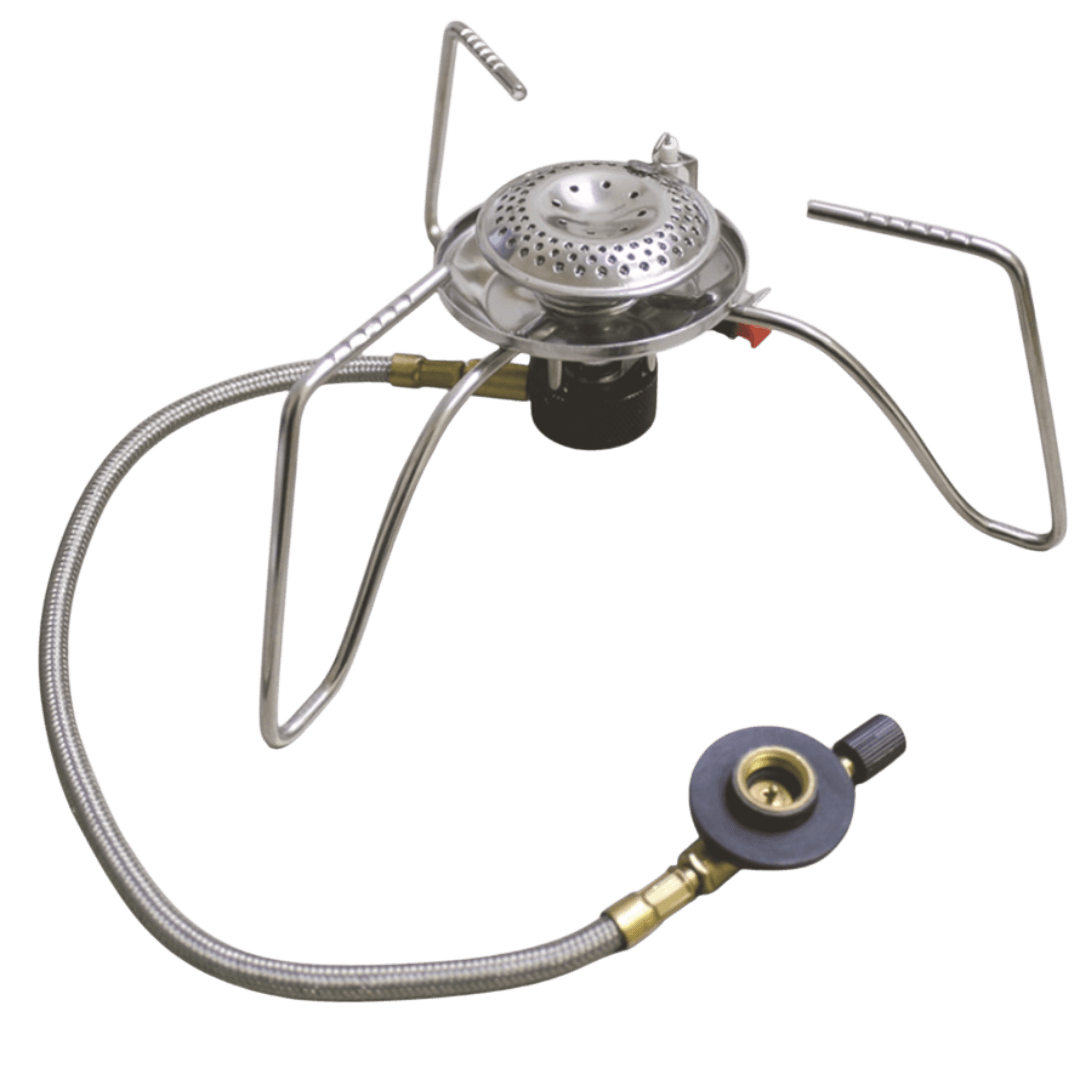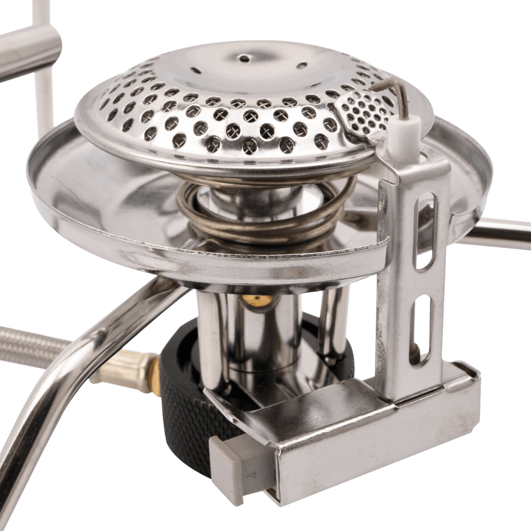 Võimas matkapliit piesoelektrilise süütajaga ja reguleeritava leegiga. EN417 spetsifikatsioonile vastav gaasiballoon ühendatakse pliidiga metallsukaga kaetud vooliku abil.