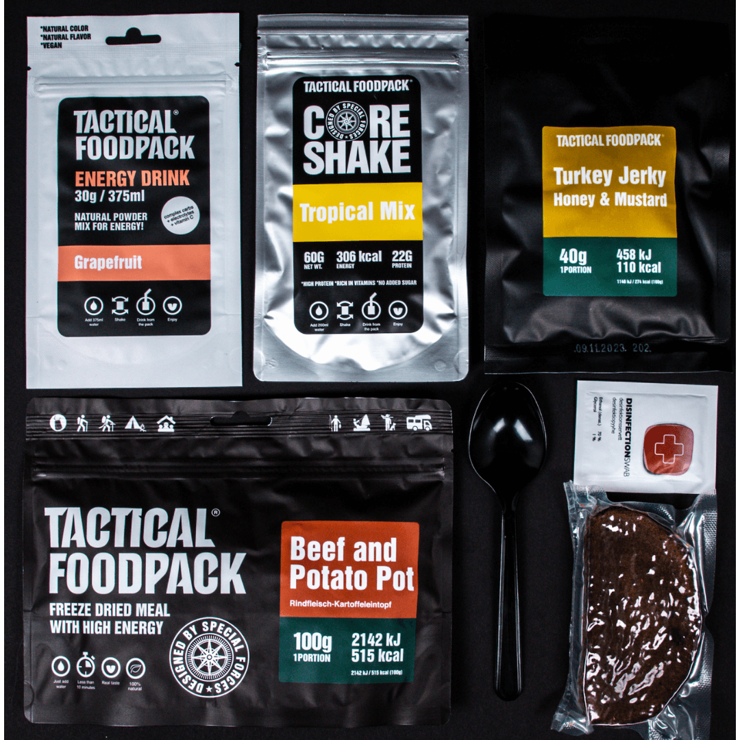 MRE ratsioonid sisaldavad ühte Tactical Foodpacki einet, vahepalasid ning energiajooki. Lisadena on kaasas kaasas lusikas, kokkuvolditav korduvkasutatav joogitops ning desinfitseeriv kätepuhastuslapp. MRE ratsiooni pakk on taassuletav. Tactical Foodpack ratsioonid Delta, Echo ja Foxtrot on mõeldud kasutamiseks taktikalistes olukordades, kus kvaliteetne toidupakk on oluline.