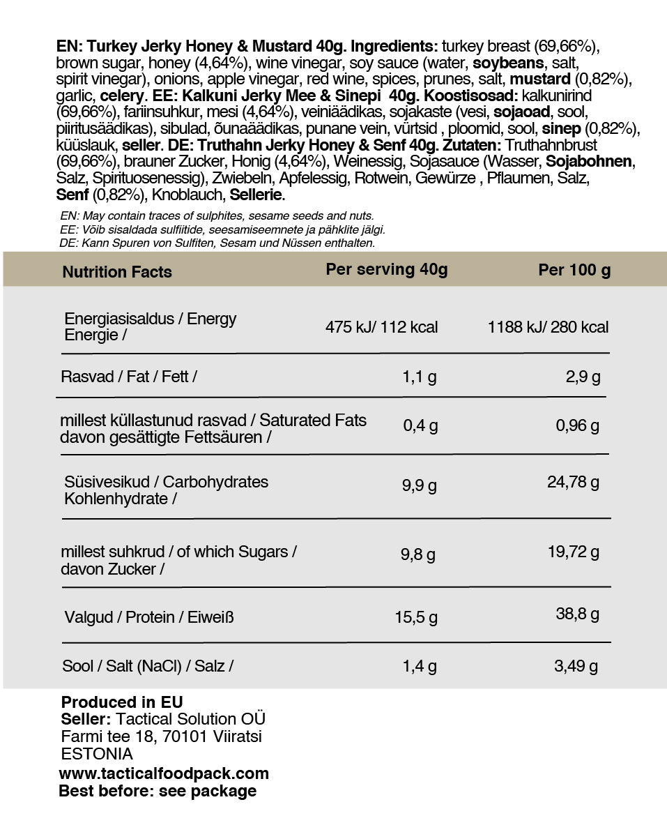 - Turkey Jerky Honey and Mustard (vinnutatud liha) – netokaal 40 g, energiasisaldus portsjoni kohta 112 kcal