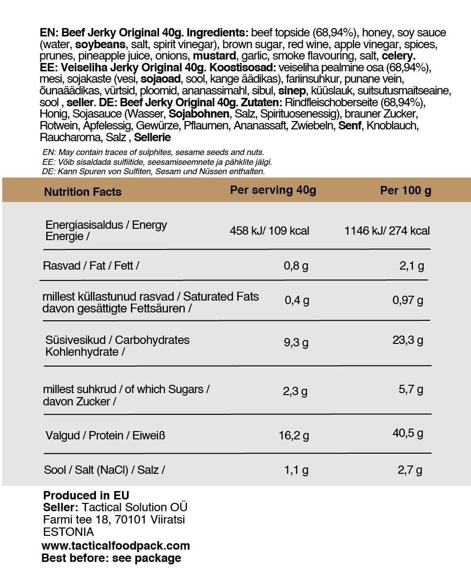 - Beef Jerky Original – netokaal 40 g, energiasisaldus portsjoni kohta 109.6 kcal