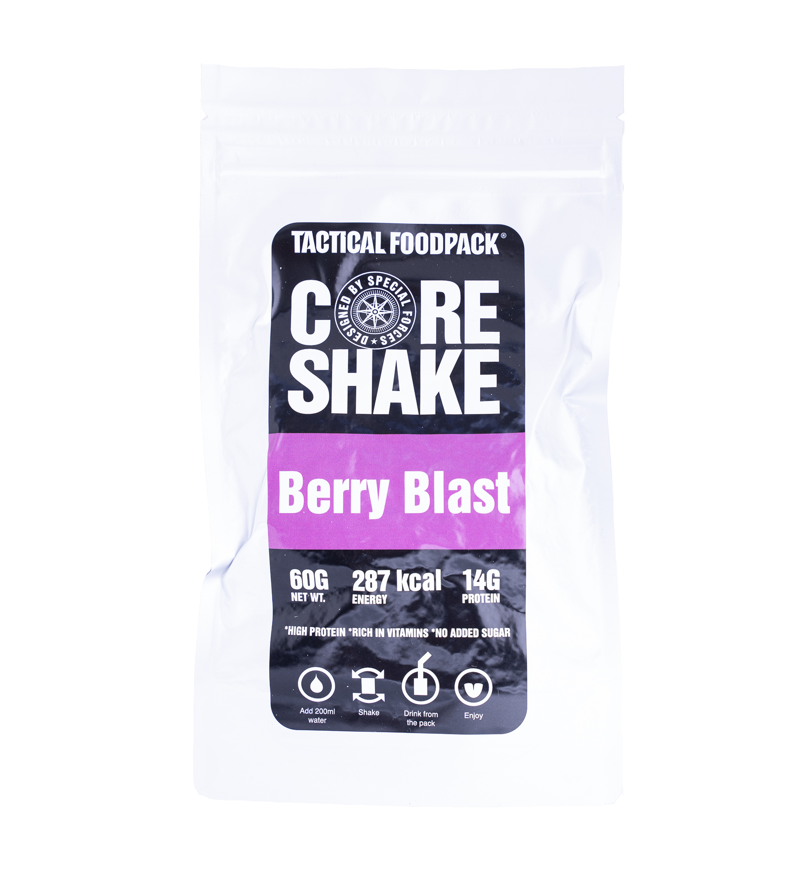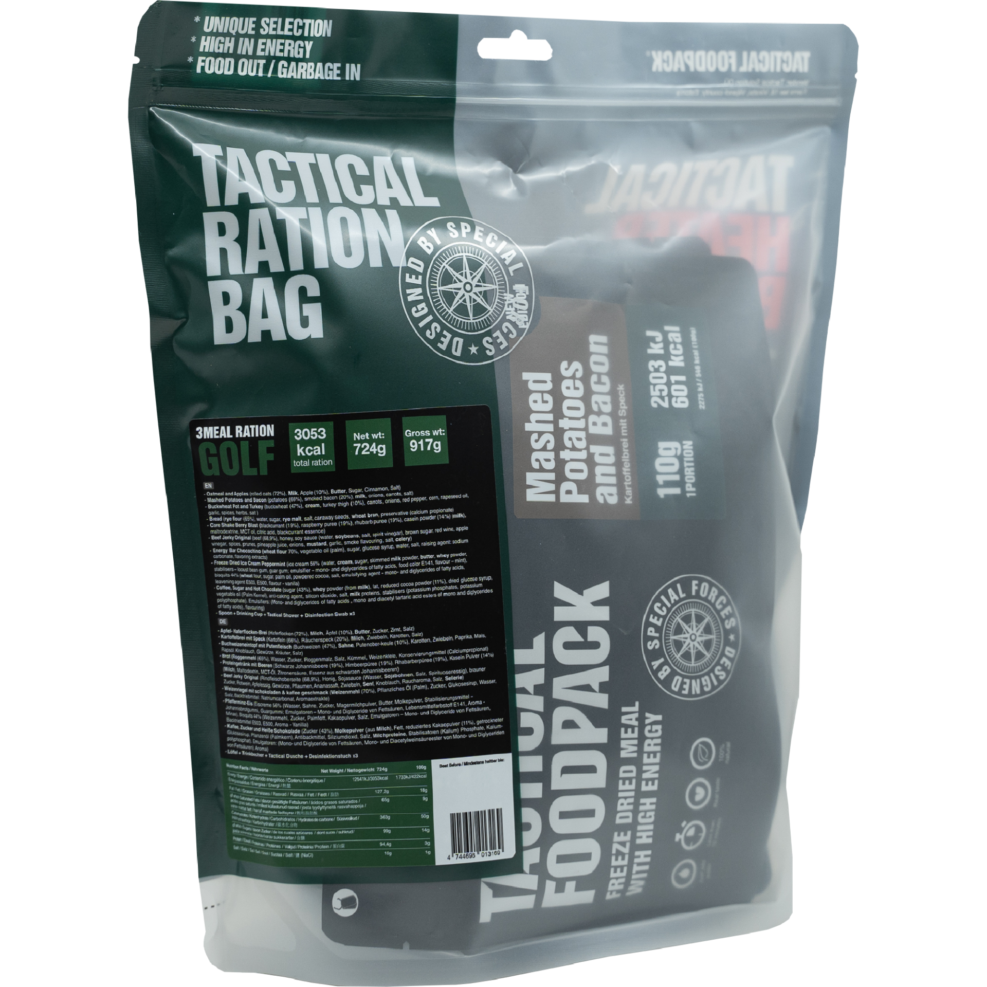 Tactical Foodpack ratsioonid Golf, Hotel ja India on mõeldud selleks, et saaksid ise oma aega ja toidukordi planeerida. Kõrge toiteväärtusega pakid sisaldavad kolme Tactical Foodpacki einet, erinevaid vahepalasid ning magustoiduks külmkuivatatud kamabatoone. Kosutavaks joogiks saad teha kohvi või kakaod. Lisadena on kaasas lusikas, Tactical joogitops ning enda hügieeni tagamiseks Tactical shower ja desinfitseerivad kätepuhastuslapid. Ratsiooni pakk on taassuletav.