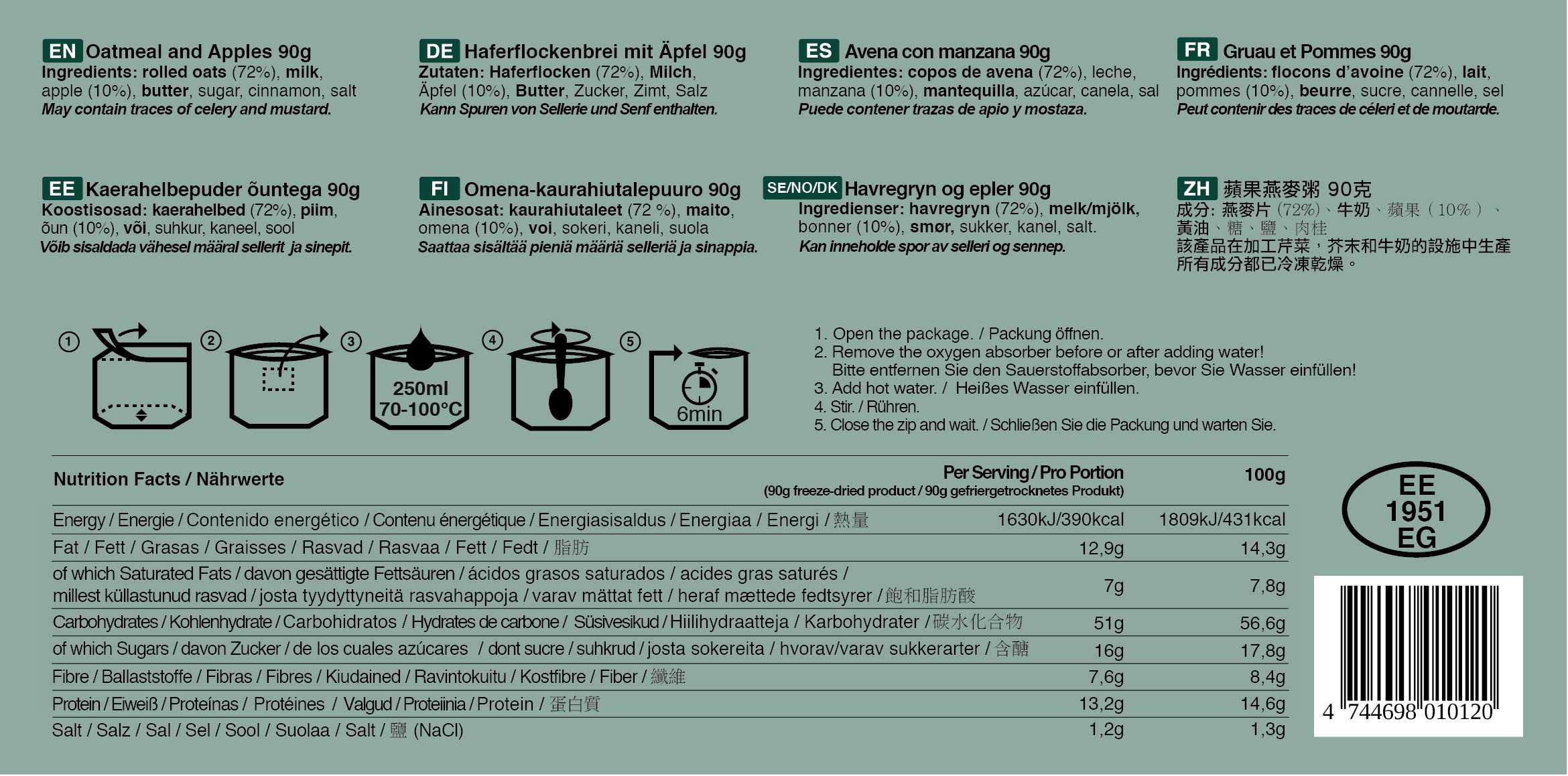- Kaerahelbepuder õuntega – netokaal 90 g, energiasisaldus portsjoni kohta 390 kcal