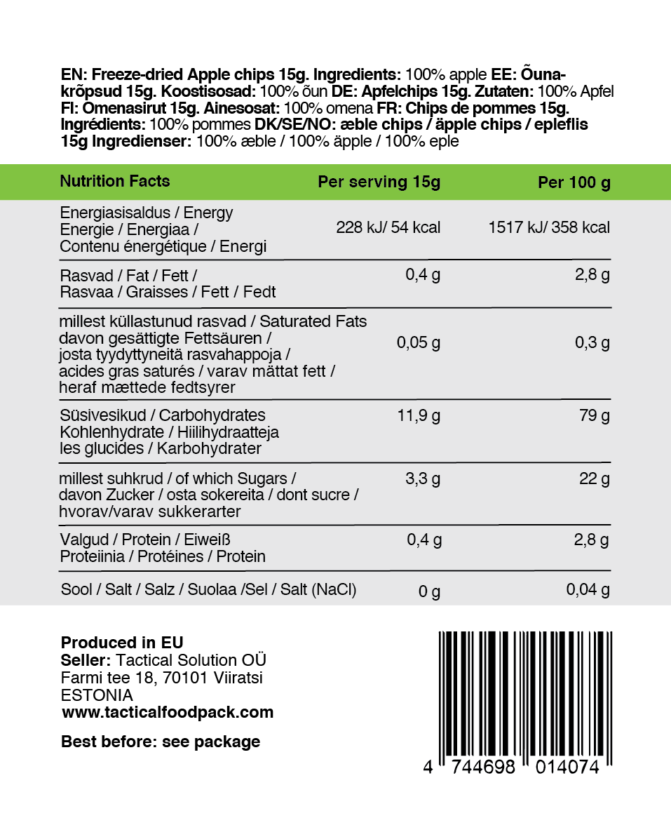 - Õunakrõpsud– netokaal15 g, energiasisaldus portsjoni kohta 54 kcal