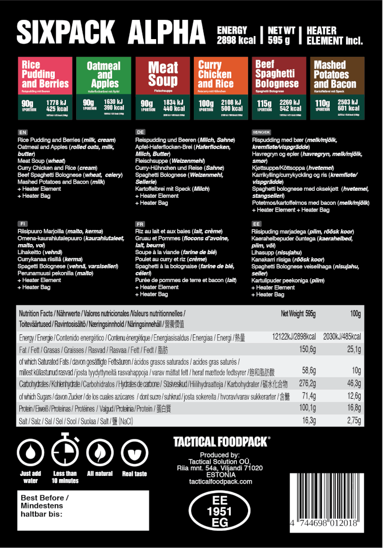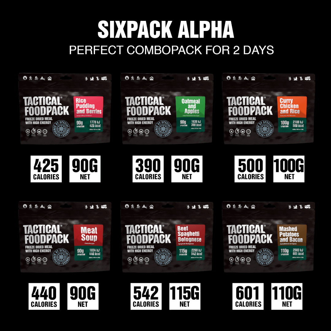 Kombopakk on mõeldud kaasa haaramiseks kahepäevasele matkale. Tactical FoodPacki SixPack Alpha sisaldab 6 erinevat toidupakki ehk 6 sooja toidukorda.
