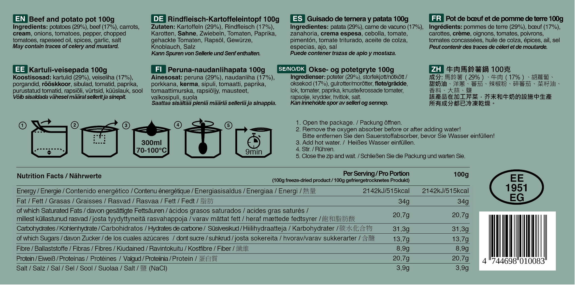 Kartulid (29%), veiseliha (17%), porgandid, rõõskkoor, sibulad, tomatid, paprika, purustatud tomatid, rapsiõli, vürtsid, küüslauk, sool. Tulenevalt tootmisliinist võib toode sisaldada vähesel määral sellerit ja sinepit.