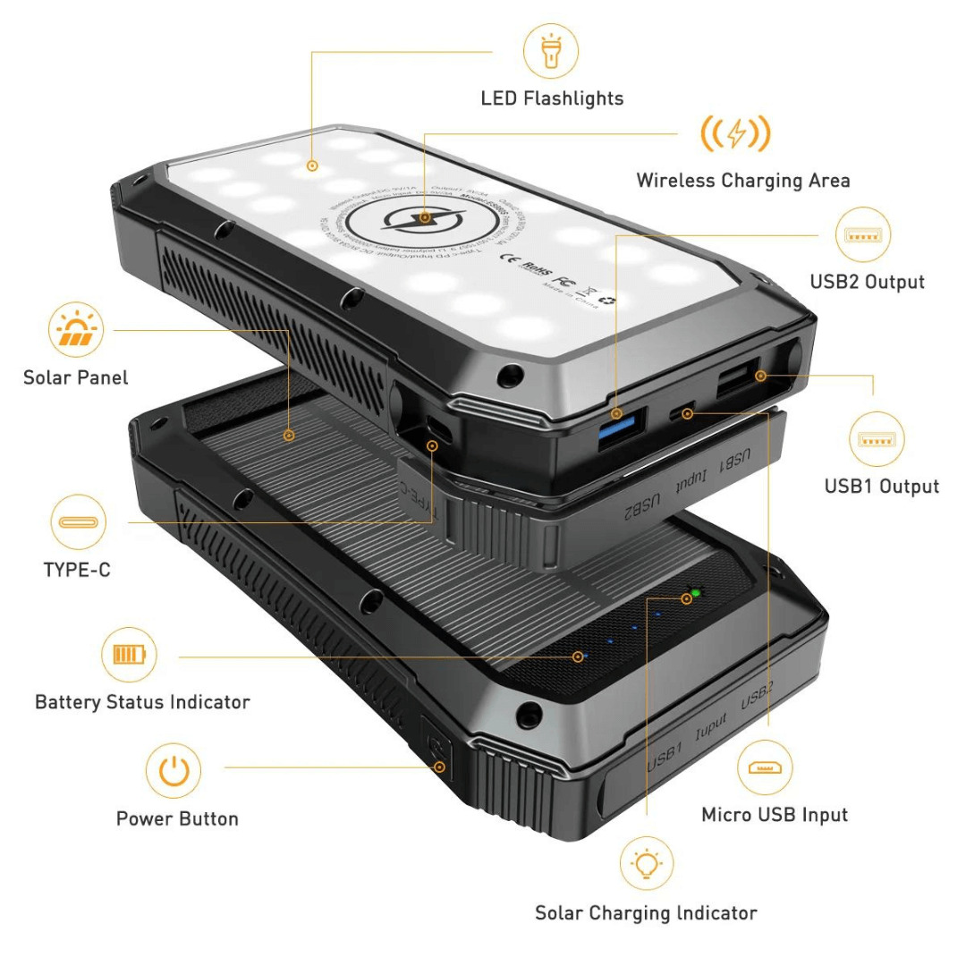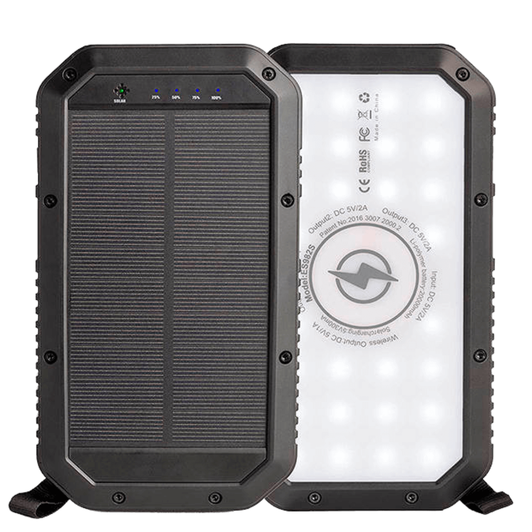 Päikesepatareiga akupank 20 000 mAh LED lamp ja juhtmevaba laadija telefonile