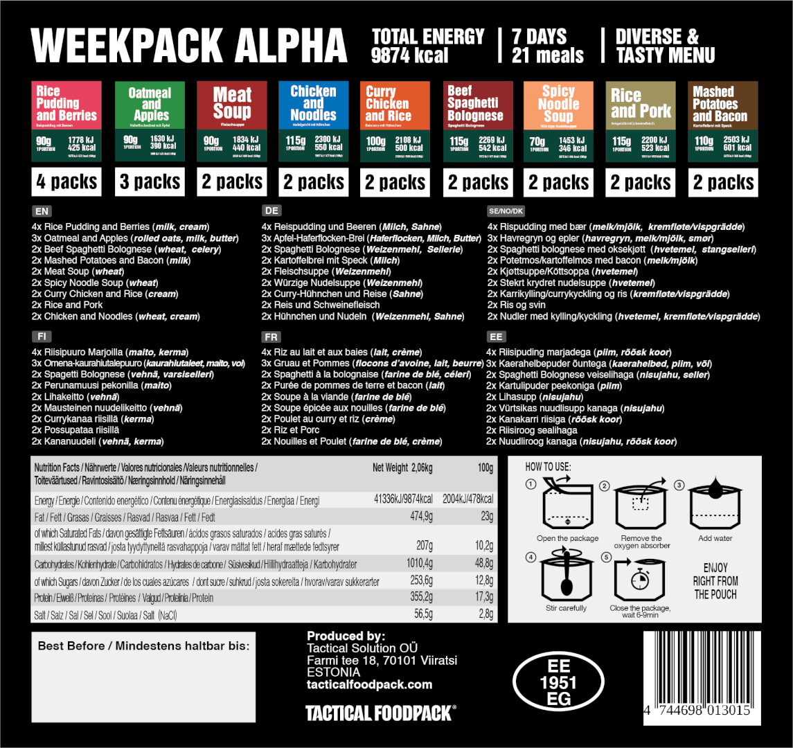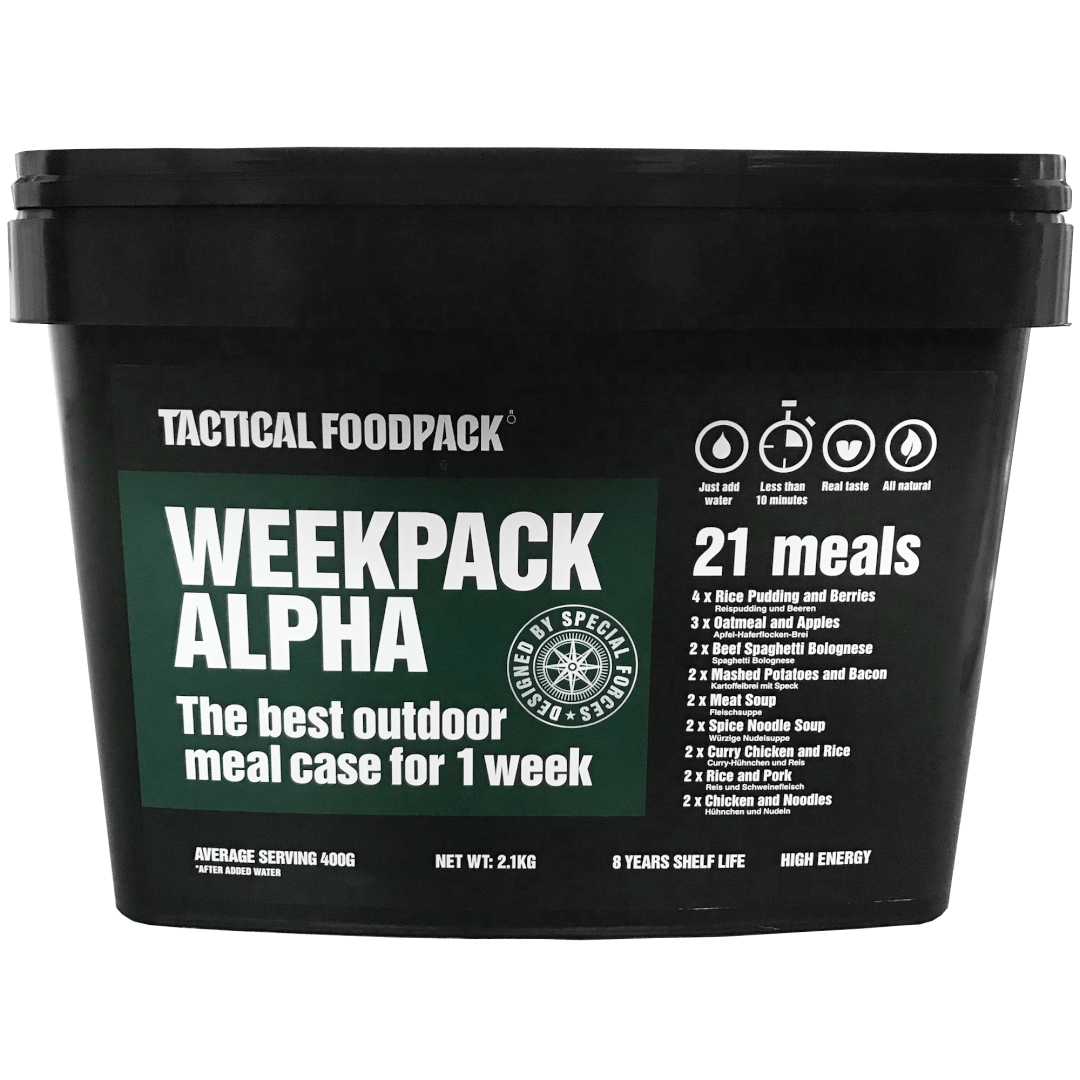 Tactical Foodpack WeekPack Alphas sisaldub terve nädala toiduvaru ühele inimesele! Kui see on olemas, on ka valmisolek metsas, merel, seiklusel ja igaks sajaks juhuks kodus, kui peaks saabuma ootamatu lumetorm, üleujutused või näiteks elektrikatkestus. Nädala toiduvaru 21 toidukorraga tagad endale vähem põhjuseid muretsemiseks.